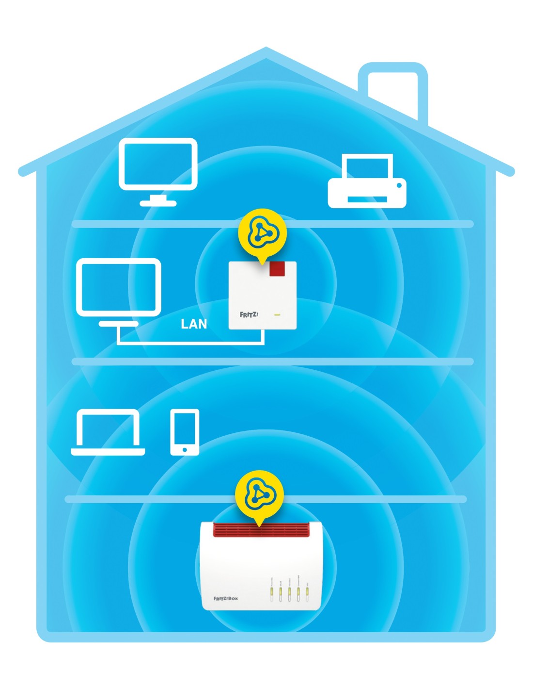 Met zijn Gigabit LAN-aansluiting integreert de FRITZ!Repeater 1200 zelfs netwerkapparaten zonder WiFi in het thuisnetwerk. De repeater overbrugt daarbij draadloos de afstand tot de router; iets waarvoor vroeger kabels moesten worden getrokken. En als er al kabels liggen, kan de repeater ook in de modus LAN-brug via een aanwezige netwerkkabel of met behulp van een Powerline-adapter worden verbonden met de router. Zo kunnen ook grotere afstanden probleemloos worden overbrugd.