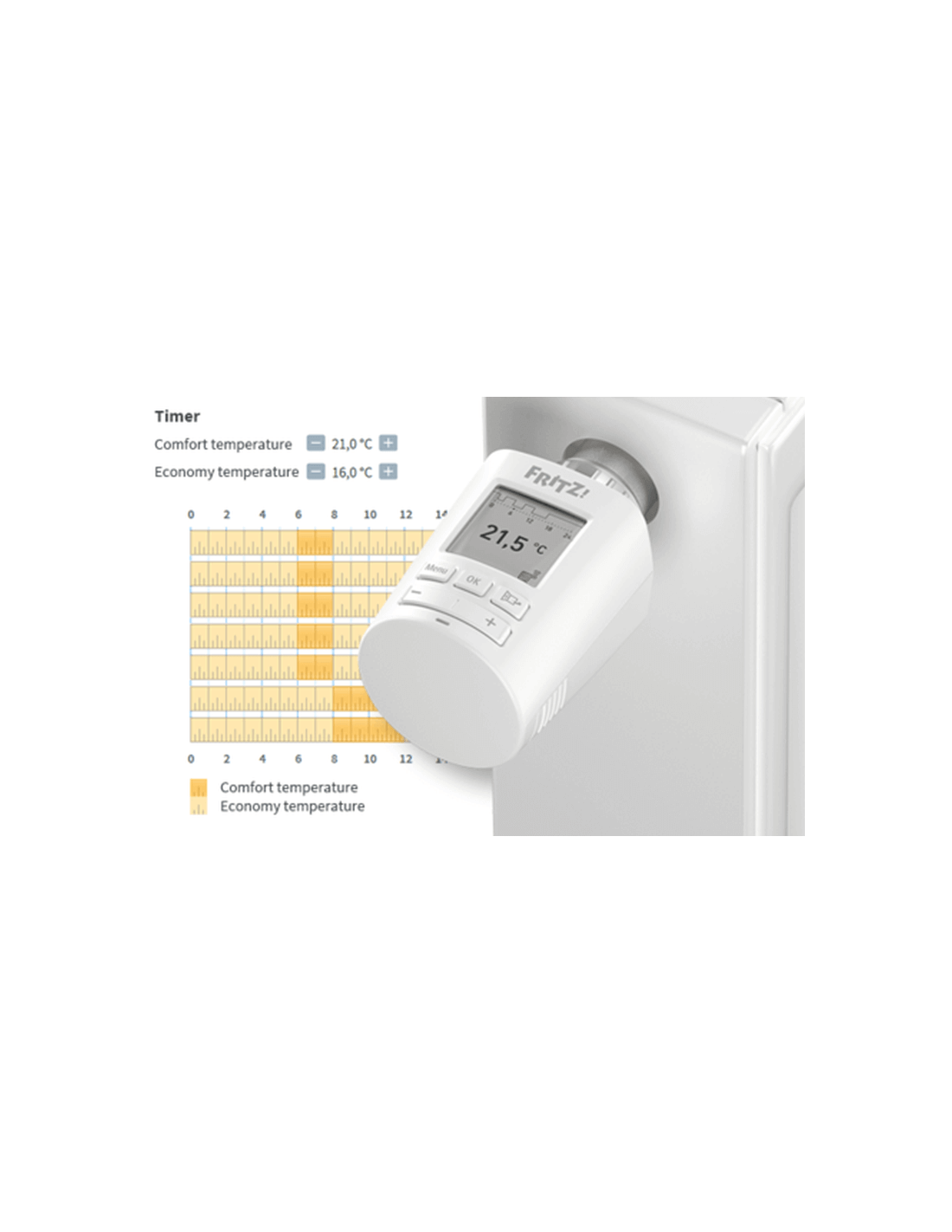 Met de slimme Open Raam detector wordt u gewaarschuwd als de FRITZ! detecteert dat er nog een raam open staat. U kunt deze dan sluiten - veilig en energiebesparend. De radiatorknop heeft een stel-wieltje waarmee je de temperatuur in de ruimte ook handmatig kunt aanpassen.