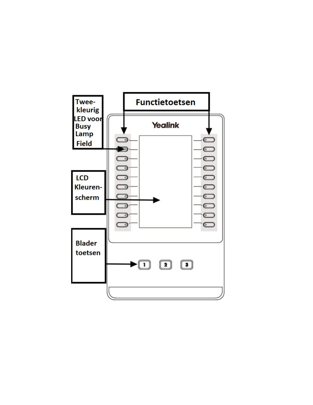 - Handig: te programmeren voor o.a. snelkiezen (speeddial), call pickup, intercom, hold, transfer, voicemail, forward, DND, etc.