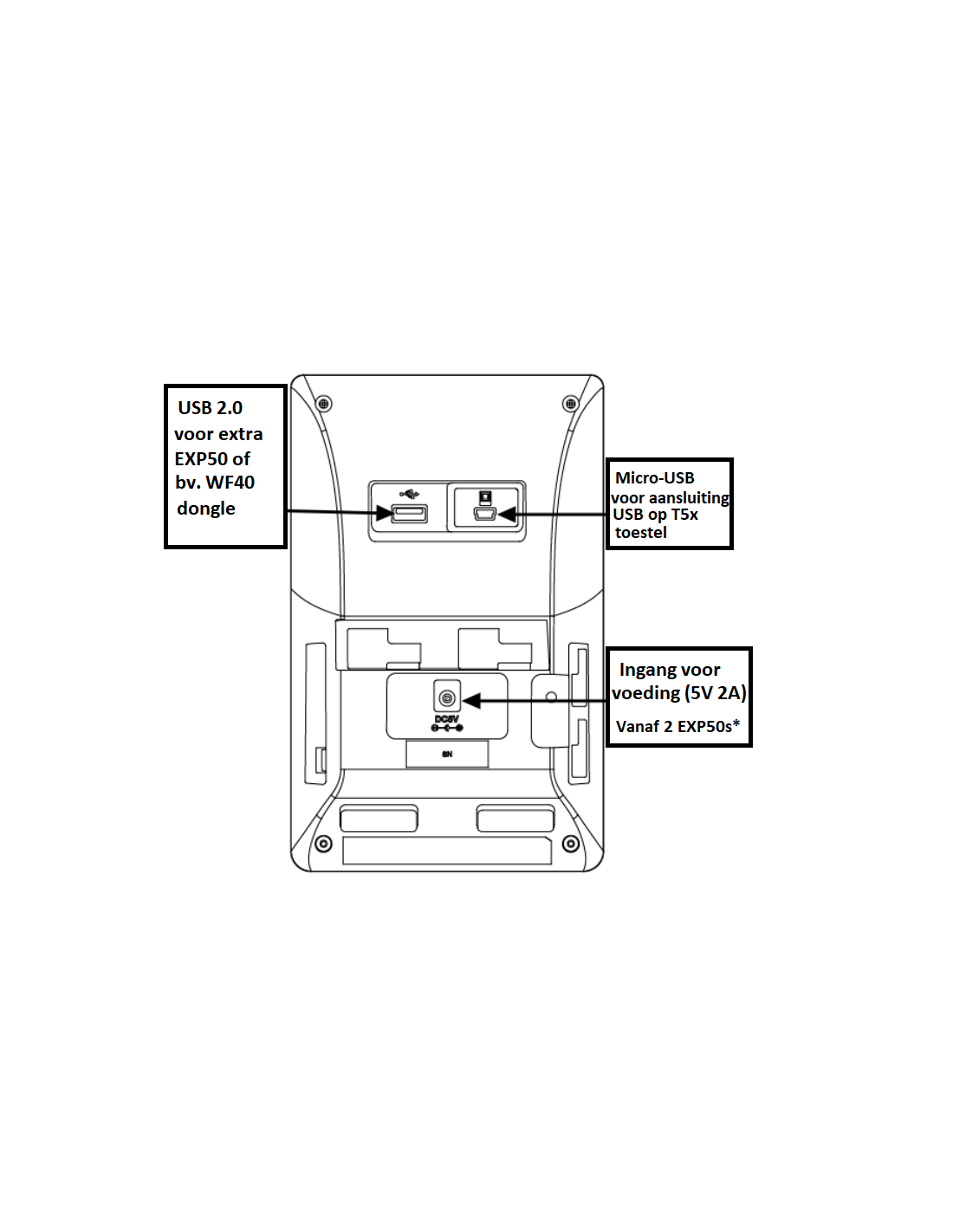 NB: Wenst u gebruik te maken van meer dan één EXP50 per toestel, dan heeft u een extra Yealink voedingsadapter (5 VDC - 2 A) nodig om de extra expansions van voeding te voorzien.