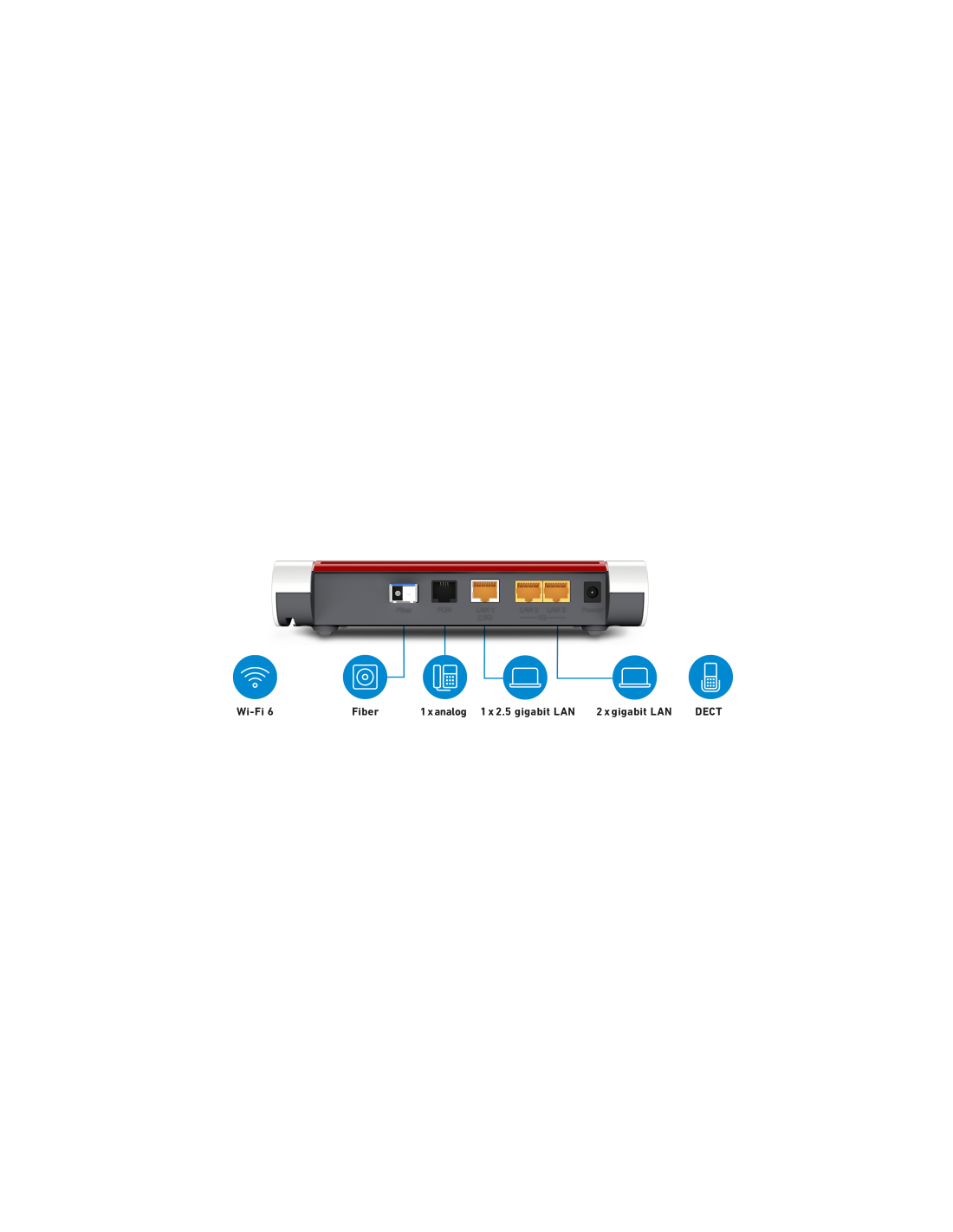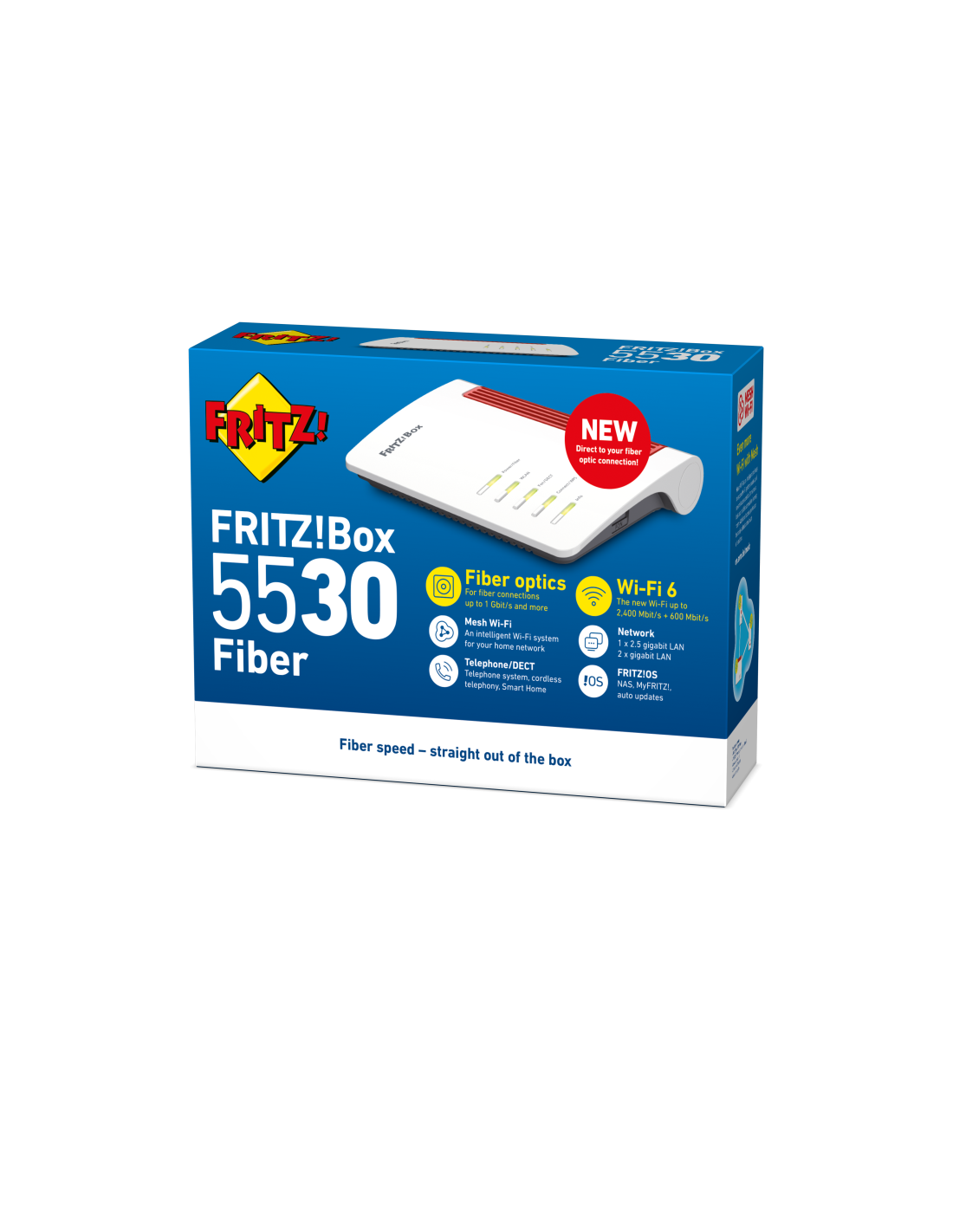 De FRITZ!Box 5530 Fiber kan rechtstreeks worden gebruikt op elke glasvezelaansluiting van het XGS-PON-glasvezelnetwerk - zonder mediaconverter of voorgeschakelde providermodem. Door de nieuwe geïntegreerde internetstandaard WiFi AX (WiFi 6) met Multi-User MIMO en een 2,5 Gigabit-LAN poort is de FRITZ!Box 5530 Fiber een betrouwbare centrale voor je thuisnetwerk.