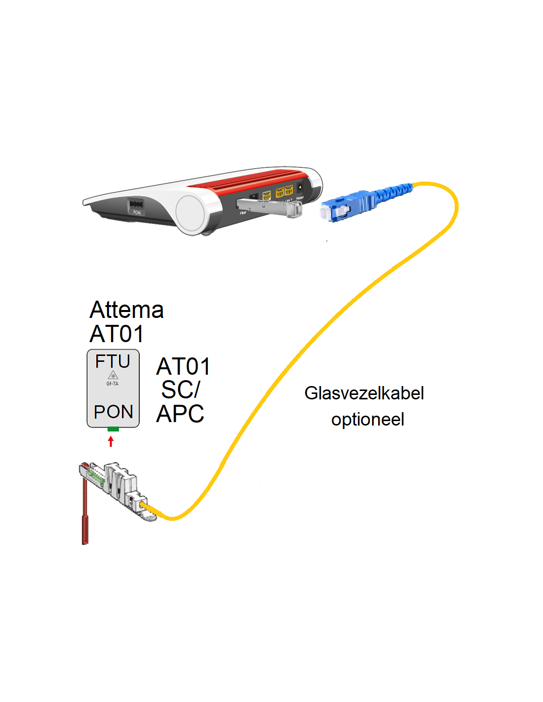- met een Attema aansluiting: Glasvezel Attema AT01 (FTU-zijde SC-GROEN - SC-BLAUW)