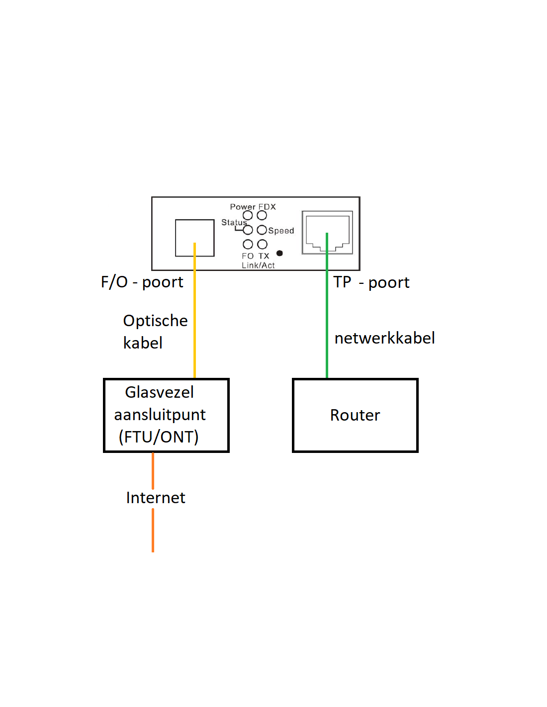 De universele mediaconverter (glasvezel naar RJ45) bied de mogelijkheid om een glasaansluiting om te zetten van een SC-UPC-connector (Blauw) naar een RJ45-netwerkaansluiting zodat het eigen modem/router zonder directe glasvezelaansluiting gebruikt kan worden.