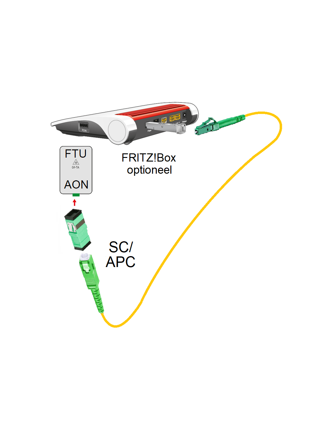 Met dit koppelblok is het mogelijk om een glasvezelkabel met een grote GROENE aansluiting (SC/APC) te koppelen op de GROENE aansluiting in uw glasvezelaansluitpunt (Fiber Termination Unit, afgekort FTU).