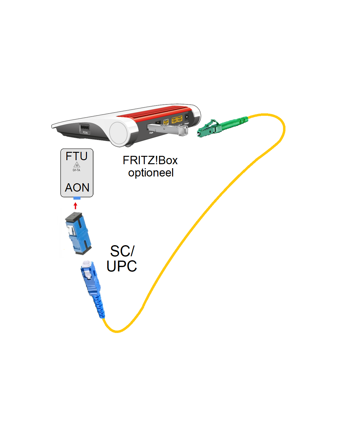 Met dit koppelblok is het mogelijk om een glasvezelkabel met een grote BLAUWE aansluiting (SC/UPC) te koppelen op de BLAUWE aansluiting in uw glasvezelaansluitpunt (Fiber Termination Unit, afgekort FTU).