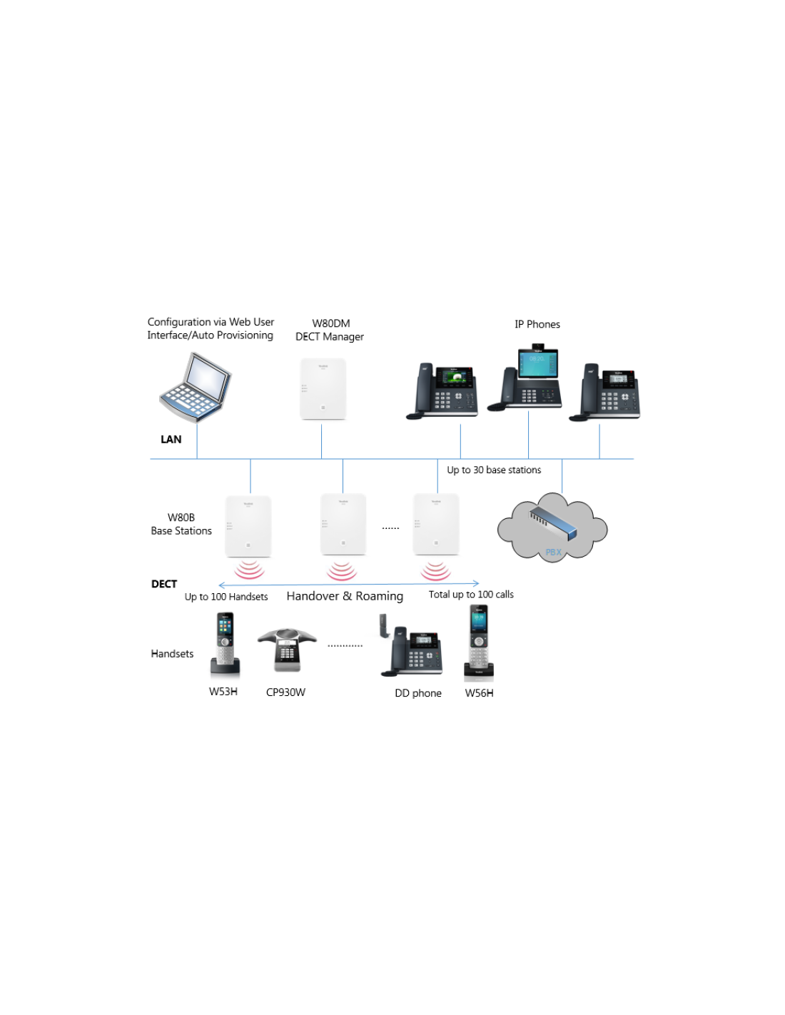 De Yealink W80DM DECT Manager is de beheerder van uw DECT netwerk. De DECT Manager is verbonden met de Yealink W80B basisstations. Op één W80DM DECT Manager kunt u maximaal 30 stuks W80B basisstations en in totaal max. 100 Yealink DECT-toestellen aanmelden. Het aantal benodigde basisstations is o.a. afhankelijk van de locatie en de gewenste gesprekscapaciteit. De Yealink W80 DECT apparatuur wordt via een netwerkkabel op uw netwerk aangesloten. Via dezelfde netwerkkabel is het mogelijk om de Yealink W80 DECT apparatuur van voeding te voorzien door de Power-over-Ethernet technologie. De Yealink W80DM DECT Manager sluit u aan op uw internetverbinding en stelt u in staat om uw professionele DECT draadloze telefoonnetwerk vanaf één punt te beheren. Op de W80DM DECT Manager meldt u één of meer W80B DECT basisstations aan. Op deze wijze kunt u uw capaciteit uitbreiden tot: