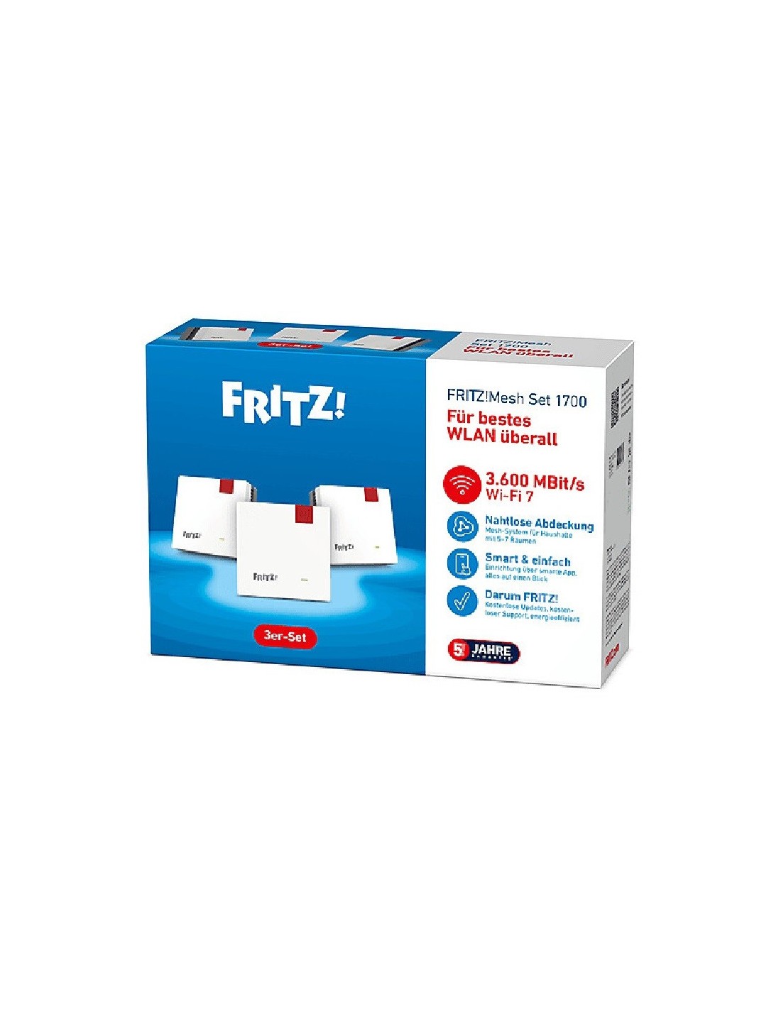 De FRITZ!Mesh Set 1700 3-pack zorgt voor snelle en betrouwbare WiFi 7 (BE) tot 3600 Mbit/s – ideaal om probleemloos te streamen, gamen of thuis te werken. Met drie krachtige FRITZ!Repeaters 1700 van deze set heb je overal naadloze WiFi-dekking en stabiele verbindingen – in elke kamer en op elke verdieping.
